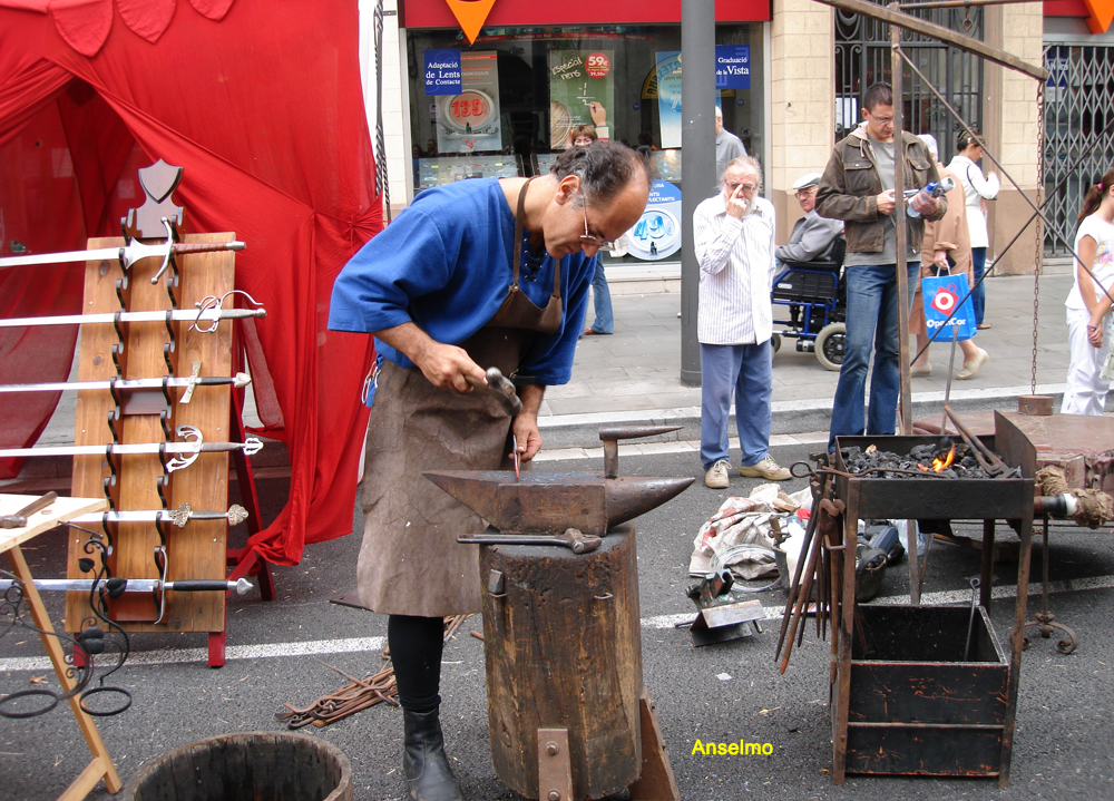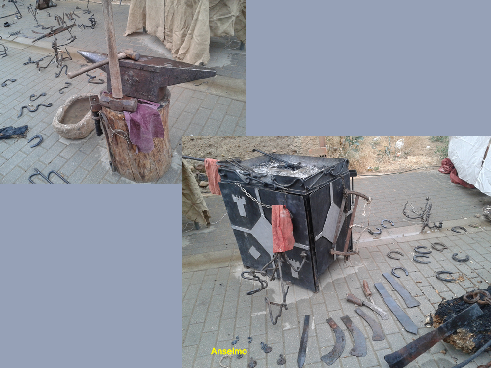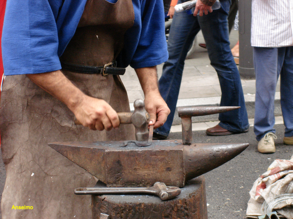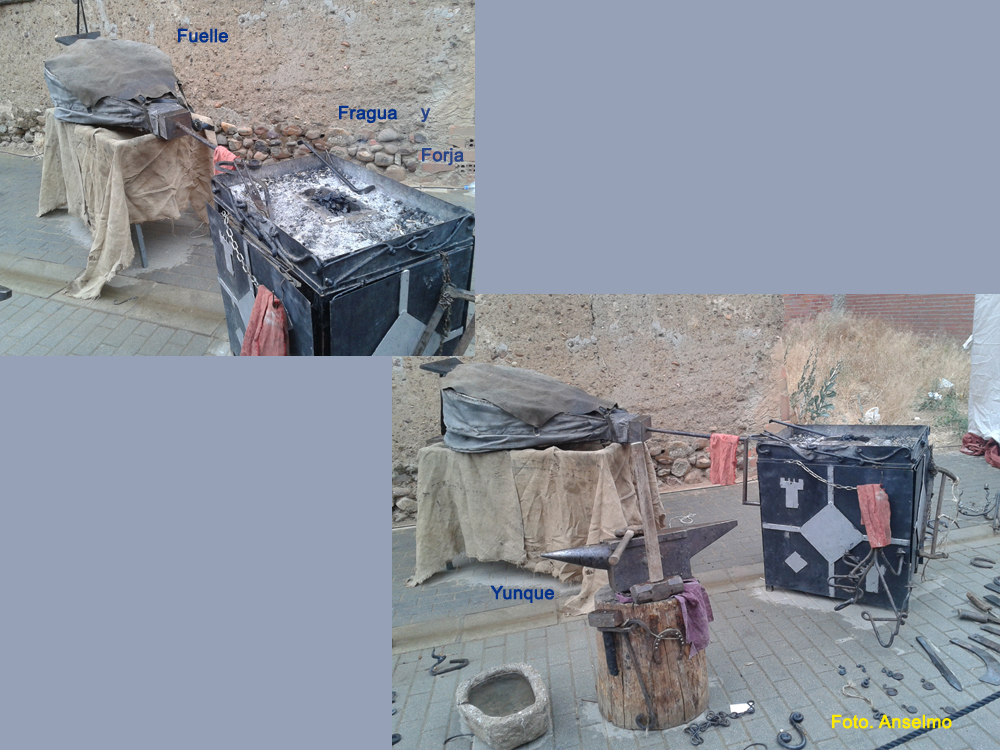 Elementos La forja es el lugar en donde se le aplica calor al metal en la herrería. Aquí se contiene y controla el volumen del fuego necesario para el trabajo. El yunque es un gran bloque de hierro o acero, a lo largo del tiempo, ha sido refinado hasta su actual forma. Los anteriores son los instrumentos básicos con los que trabajan los herreros. Además, utilizan algunas de las siguientes herramientas, dependiendo del tipo de labor que efectúen: Las tenazas son usadas para asir el metal incandescente. Varían en un rango de formas y tamaños. Los moldes son instrumentos para dar forma al metal. Estos se calientan de modo tal que el metal se derrite y sale a través de aberturas previamente marcadas en el molde. Por esos orificios se introduce el metal fundido de forma que cuando se enfría y se rompe el molde se reproduce la forma deseada en el metal. Con ello, por ejemplo, se pueden fabricar las formas particulares de las cucharas, las herraduras, etcétera. La fragua es la herramienta donde se coloca el carbón para calentar las piezas de metal para que puedan ser forjadas y tengan maleabilidad al momento de darles forma, esta fragua puede funcionar con un ventilador que inyecta aire para que el carbón arda y así poder trabajar el meta |