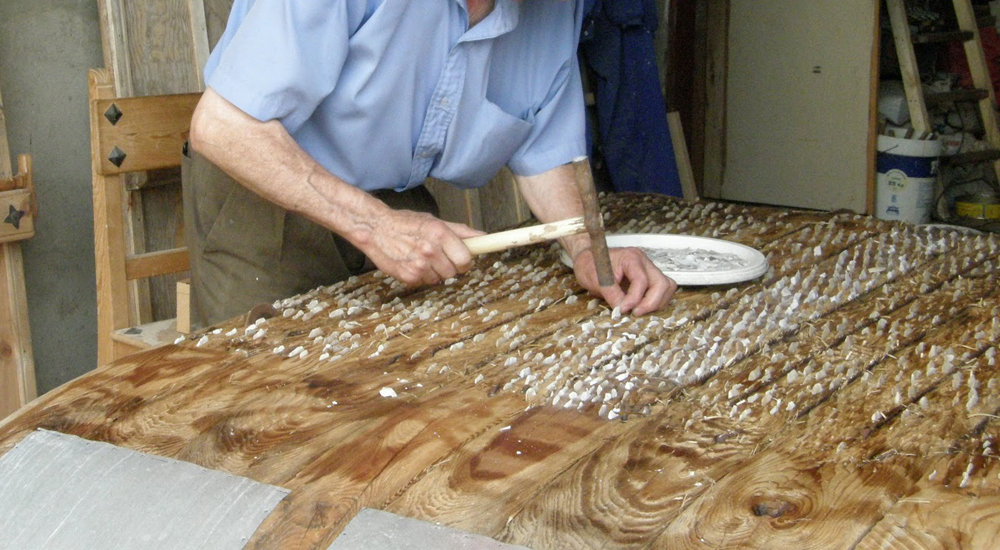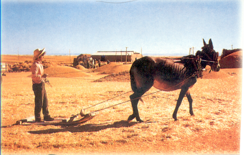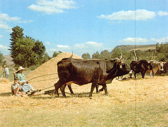 | PROCESO DE FABRICACION DEL TRILLO Primera fase: Preparación de la madera (corte y almacenaje). En primer lugar, se procede al cortado del pino, que inmediatamente se sierra en trozos de 2 a 2,5 m. .de longitud; Segunda fase: De tres a cuatro pies de ancho y unos seis de largo, variando frecuentemente estas dimensiones, se compone de cuatro o cinco tablones ensamblados unos con otros, de más de cuatro pulgadas de grueso, en los que se horadaban unos tres mil orificios destinados a encajar en ellos las piedras de pedernal duras y cortantes que se encargaban de separar el grano de la paja. La operación se realizaba con el escoplo y el mazo. Cada muesca u orificio necesitaba para su perfecto ajustado unos seis golpes de mazo, lo que puede dar una leve idea de lo costoso y laborioso que le resultaría al labrador la construcción de uno solo de estos trillos. En la parte anterior hay clavada una argolla para atar la cuerda que le arrastra, y a la que se enganchan comúnmente dos caballerías; y sentado un hombre en el trillo lo conduce dando vueltas sobre la parva extendida en la era. Si el hombre necesita más peso, pone encima piedras grandes» |